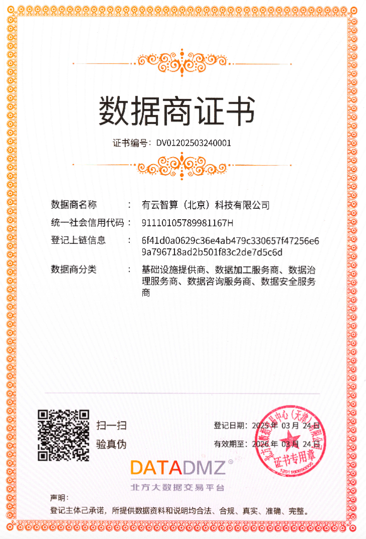 近日,首衡科技子公司有云智算獲得北方大數(shù)據(jù)交易中心合格數(shù)據(jù)商認(rèn)證,成為可提供數(shù)據(jù)加工、數(shù)據(jù)治理、數(shù)據(jù)咨詢(xún)及數(shù)據(jù)安全等全鏈條服務(wù)的專(zhuān)業(yè)數(shù)據(jù)商,將以高標(biāo)準(zhǔn)的數(shù)據(jù)服務(wù)能力,為農(nóng)業(yè)產(chǎn)業(yè)數(shù)智化升級(jí)注入強(qiáng)勁動(dòng)能。