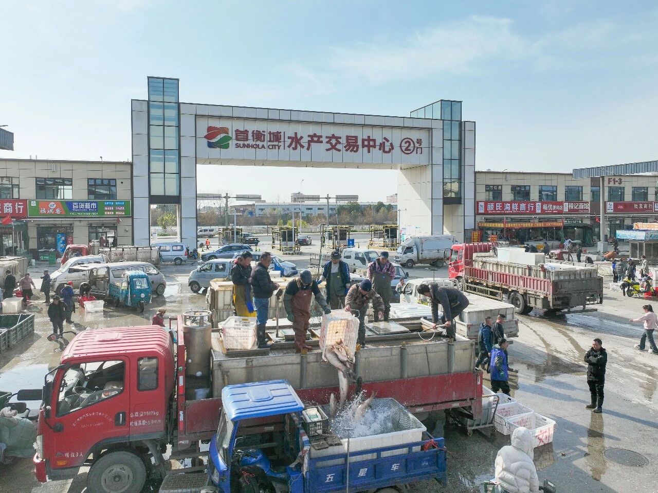 午后兩點的孝感首衡城,暖陽正好,更添幾分旺盛人氣。水產交易區內,裝載著鮮活魚蝦的貨車川流不息,商販的吆喝聲、電子結算的提示音、魚蝦的碰撞聲交織成熱鬧的交響曲。