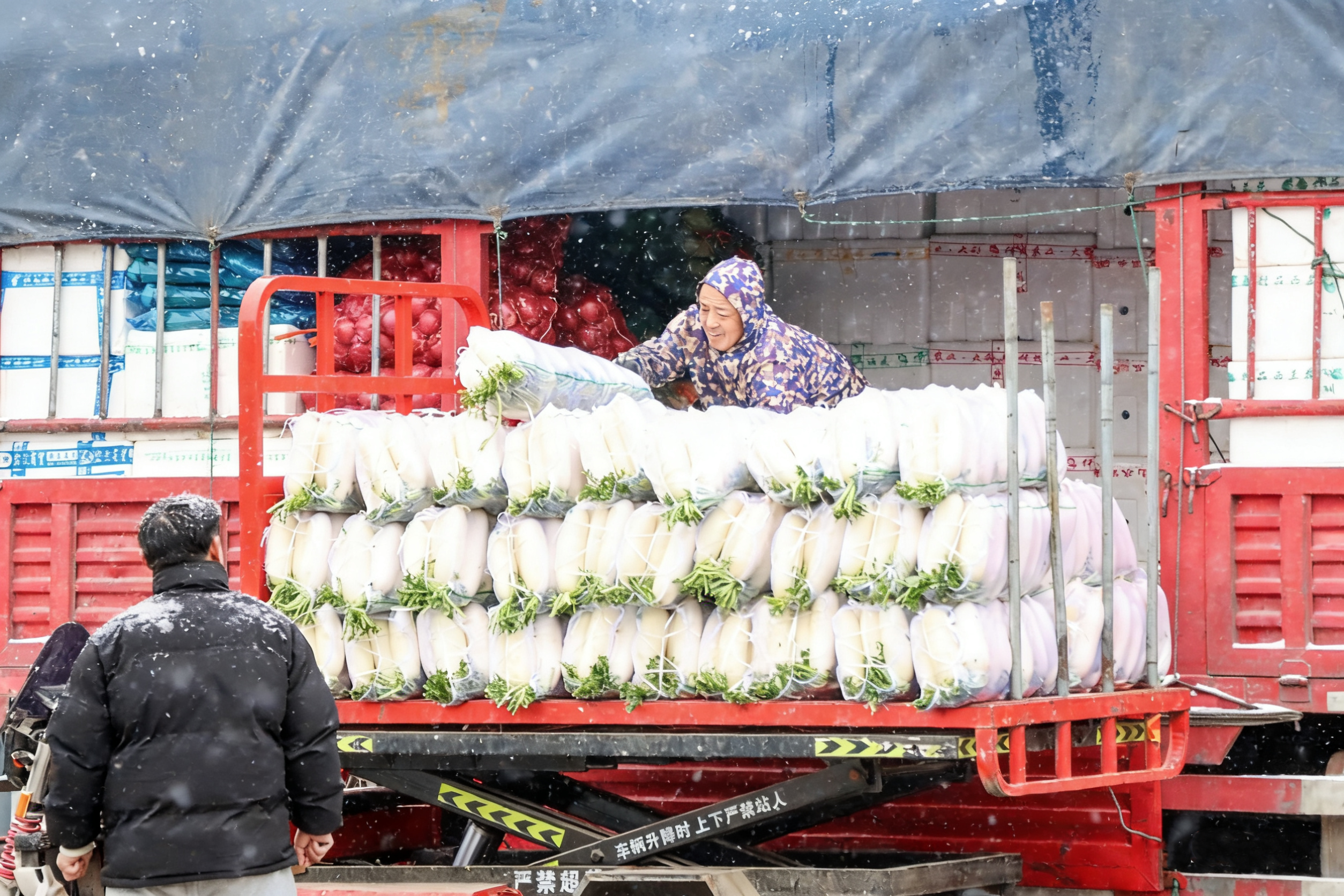 在主營本地生鮮的“聯(lián)康商行”檔口,負(fù)責(zé)人正指揮工人將剛到的蔬菜快速裝車。“市場提前發(fā)了寒潮降雪預(yù)警,我們連夜對接了三汊、臥龍、陡崗的種植基地,還加訂了南方產(chǎn)區(qū)的補貨,供應(yīng)完全跟得上。”