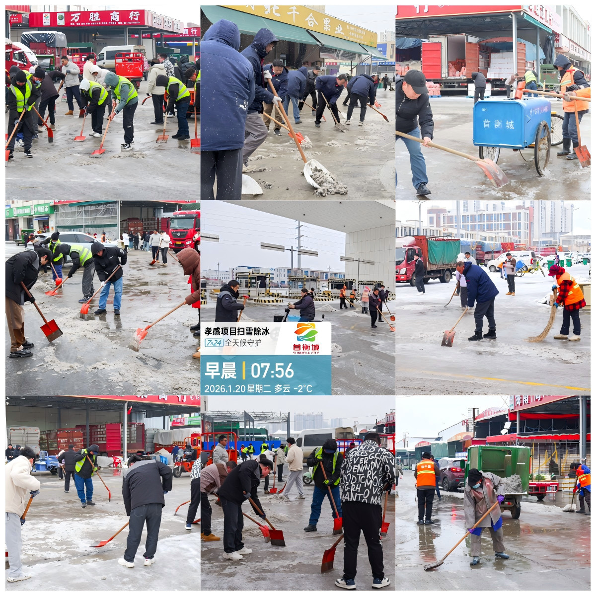物流通暢是保供的關(guān)鍵一環(huán)。首衡城提前與氣象、交通部門建立聯(lián)動機制,精準(zhǔn)獲取降溫、雨雪預(yù)報信息,規(guī)劃多條應(yīng)急運輸路線,為保供車輛協(xié)調(diào)通行便利。同時聚焦防寒除雪雙重防護(hù):給室外消防管道、生活水管加裝保溫棉防冰凍,每日巡檢移動大棚防積雪坍塌,各區(qū)域配齊防滑墊、雪鏟、鐵鍬、大竹掃把、融雪劑等鏟雪除冰物資,20日清晨第一時間組織全員開展鏟雪除冰作業(yè),全方位筑牢通行防線,確保車輛進(jìn)出、貨物轉(zhuǎn)運高效有序。